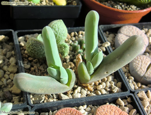 I've had these two Gibbaeum geminum for a couple of months and they seem to feel fine so far. They grow very slowly but react to water quite well. They are much much smaller than I imagined seeing them on photos online! One of them is growing in a pot with two Conophytum plants. The photo is being photobombed by a Nananthus aloides :D